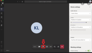 Husk at slå din mikrofon fra, når du live-streamer og ikke selv skal deltage i samtaler om undervisningen. På den måde bliver underviser og de andre deltagere ikke forstyrret af tryk på tastaturet, intern snak i arbejdsgrupper eller din hunds gøen. Når du deltager i en live-streaming/en online samtale, vil du som regel kunne se et lille mikrofonikon på din skærm, f.eks. ved dit eget navn/dit eget billede. I Microsoft Teams vil det f.eks. se nogenlunde ud som på billedet herunder, hvor mikrofonen er markeret med den røde pil. Du slår mikrofonen fra ved at trykke på ikonet. Dette gælder i Teams og i de fleste lignende programmer, f.eks. Zoom.