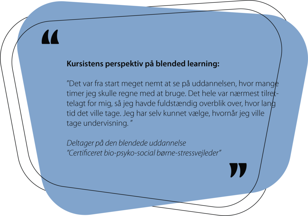 Ved at kombinere det traditionelle kursusforløb med digitale læringsaktiviteter bliver dette netop muligt, og derfor kan man nå et meget højt læringsniveau og -udbytte. Kursisterne kan i ro og mag gennemgå den relevante teori i de digitale lektioner, hvorefter de fx mødes på fysiske kursus- og træningsdage. Når det sker, har de dermed allerede de samme forudsætninger samt et fælles sprog, og sammen med underviseren kan de derfor fokusere på at få forankret den nye viden og redskaberne i relation til deres praksis. Det hæver det taksonomiske niveau markant.