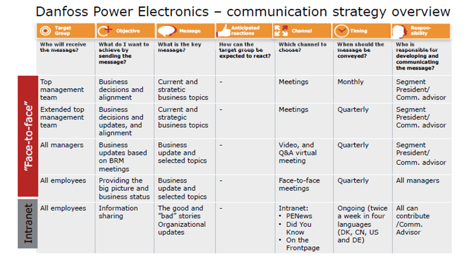 Eksemplet nedenfor er et overblik over strategien for topledelsens interne kommunikation i 2015 til omkring 4.000 medarbejdere overalt i verden i forretningsområdet Danfoss Power Electronics: