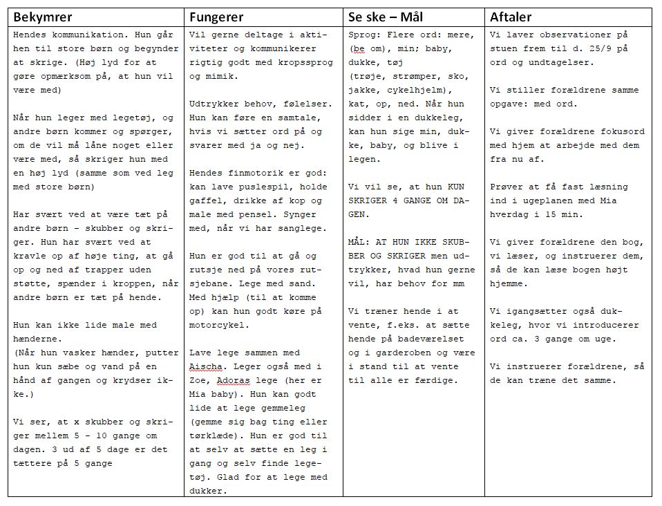 Med bekymringer afdækkes med andre ord konkrete beskrivelser af adfærd, samt vilkår barnet har for deltagelse. Hvad sker der helt konkret i konteksten, hvor barnet er udfordret? Hvordan viser det sig? Hvornår sker det? Hvor ofte sker det? Sammen med hvem sker det med (både børn og voksne)?