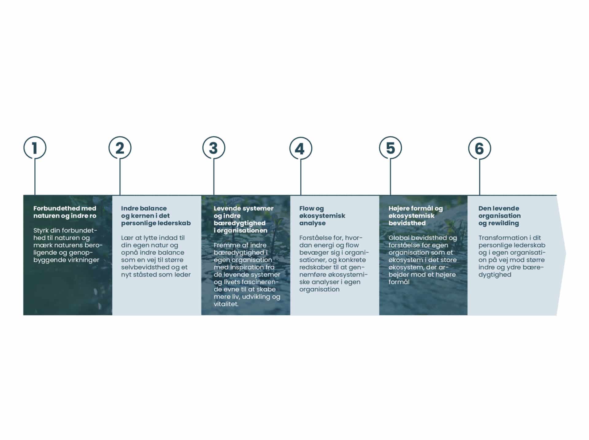 Naturen vil både være læringsrum og inspirator, og med udgangspunkt i begreber som biophilia, økosystemisk tænkning og levende systemers design får du indsigt i, hvordan du kan være med til at forandre rammerne og kulturen i din organisation i en mere bæredygtig retning og med større vægt på balance, sammenhæng, diversitet og vitalitet. Vores oplevelsesorienterede tilgang til den regenerative ledelse sikrer, at uddannelsen ikke kun giver et solidt teoretisk fundament, men skaber mulighed for en reel udvikling.