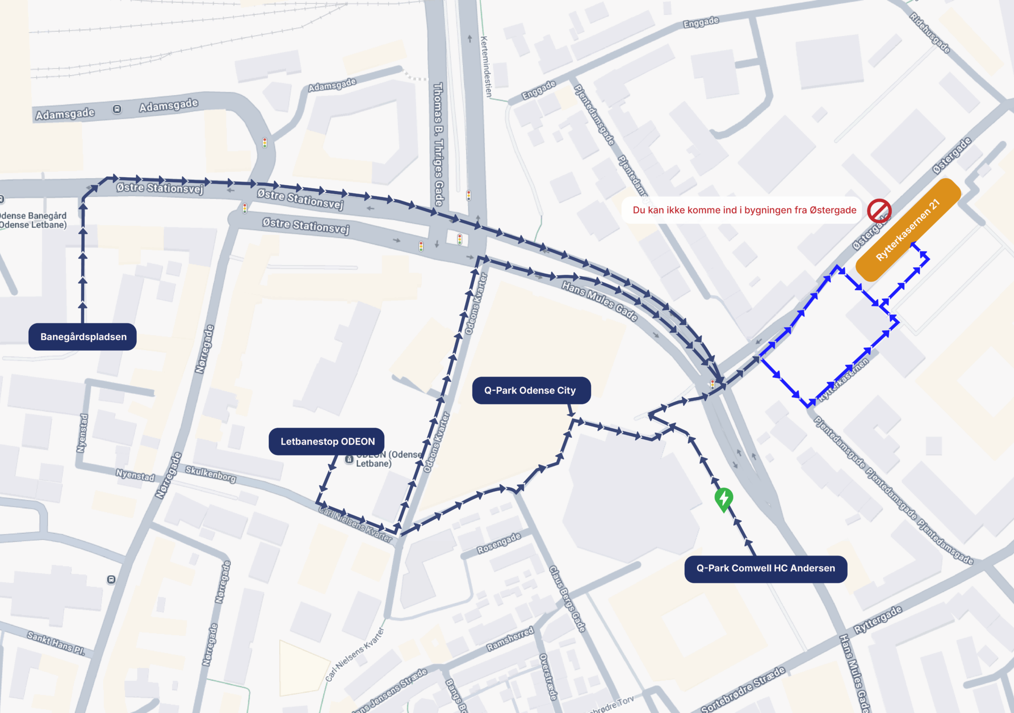 Kommer du i elbil, ligger der en Clever Charging Station blot 240 meter fra Rytterkasernen ved Q-Park Comwell HC Andersen.